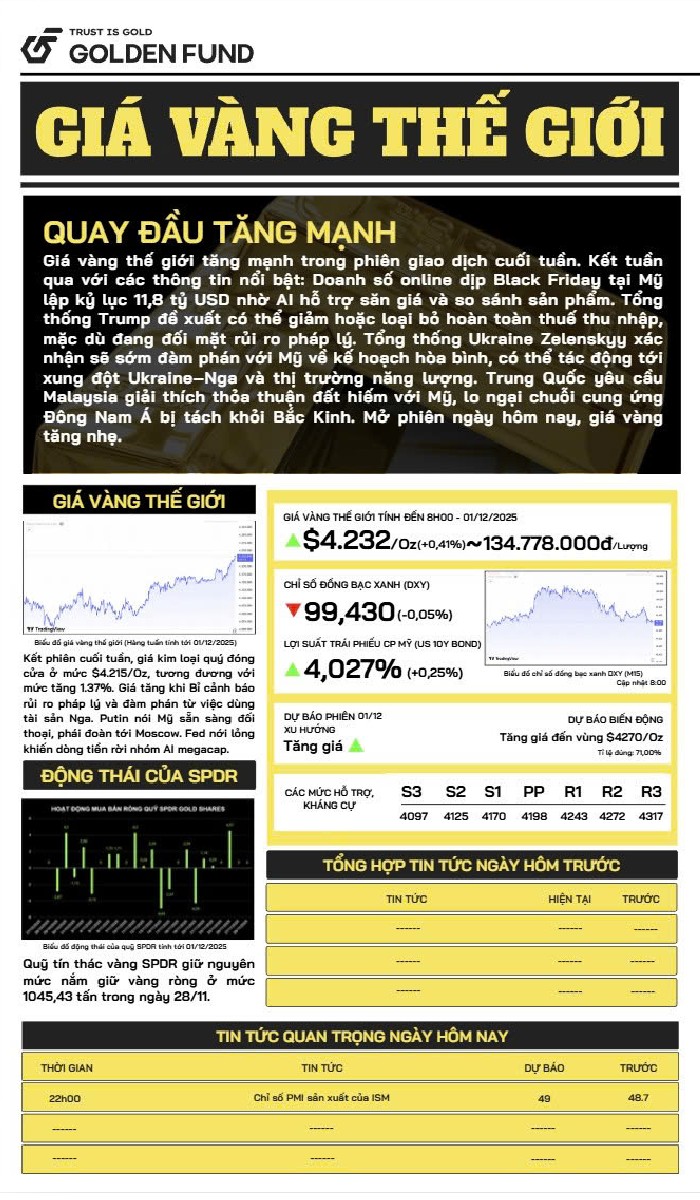 Giá vàng thế giới tăng mạnh phiên cuối tuần nhờ nhiều yếu tố hỗ trợ như doanh số Black Friday tại Mỹ lập kỷ lục, đề xuất giảm thuế của ông Trump và thông tin hòa đàm Ukraine–Mỹ; Trung Quốc cũng yêu cầu Malaysia giải thích thỏa thuận đất hiếm với Mỹ. Mở phiên hôm nay, vàng tiếp tục tăng nhẹ. Trong nước, giá vàng SJC tăng lên 155,70 triệu đồng/lượng với chênh lệch mua – bán 2 triệu đồng.