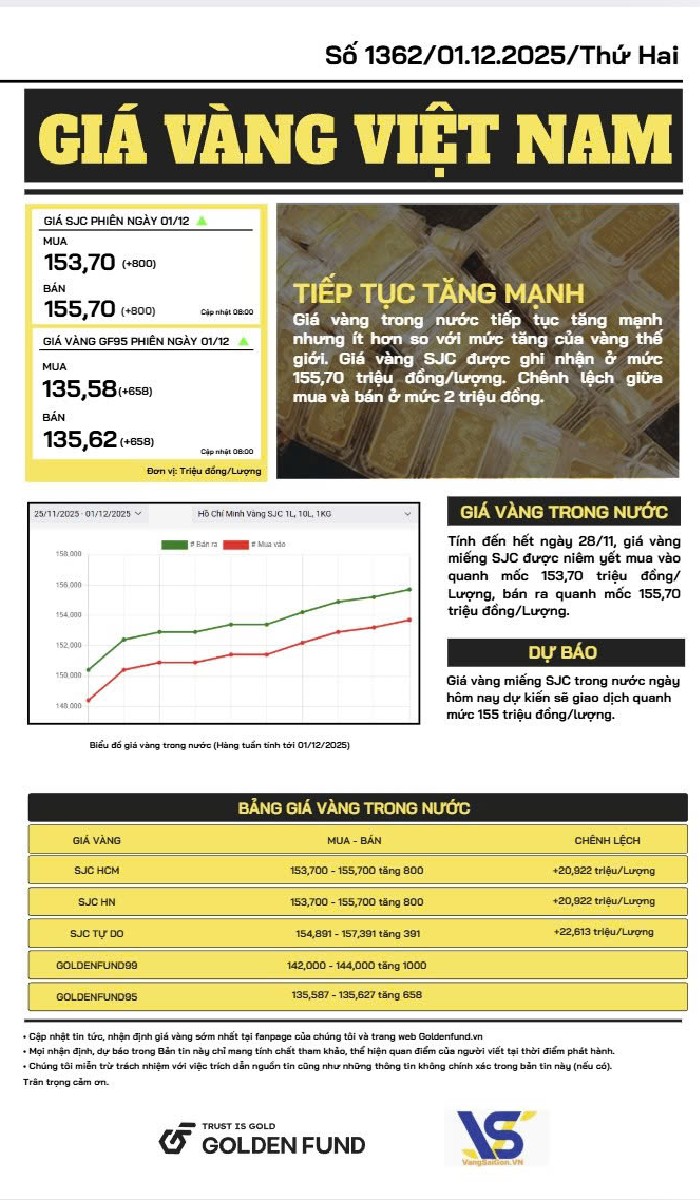 Giá vàng miếng SJC trong nước ngày hôm nay 01/12/2025 dự kiến sẽ giao dịch quanh mốc 155 triệu đồng/Lượng.