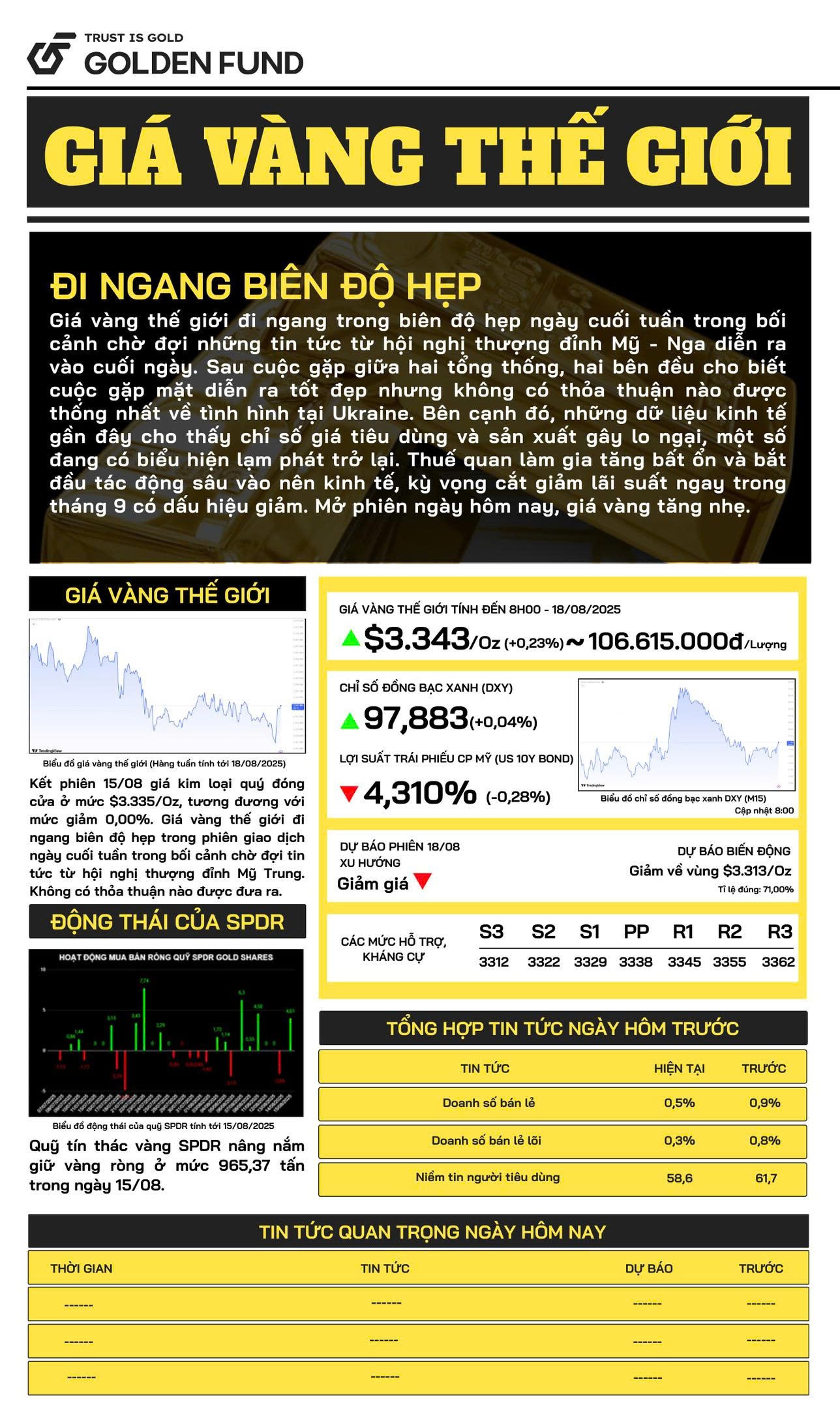 Giá vàng thế giới đi ngang biên độ hẹp trong phiên giao dịch cuối tuần. Hội nghị thượng đỉnh Mỹ - Nga diễn ra vào cuối tuần, kết thúc mà không có một thỏa thuận nào được đưa ra. Tuy nhiên, hai bên đều cho biết cuộc gặp diễn ra tốt đẹp. Về kinh tế Mỹ, những chỉ số kinh tế gần đây cho thấy lạm phát quay trở lại, kỳ vọng cắt giảm lãi suất trong tháng 9 giảm xuống. Giá vàng trong nước điều chỉnh giảm nhẹ.
