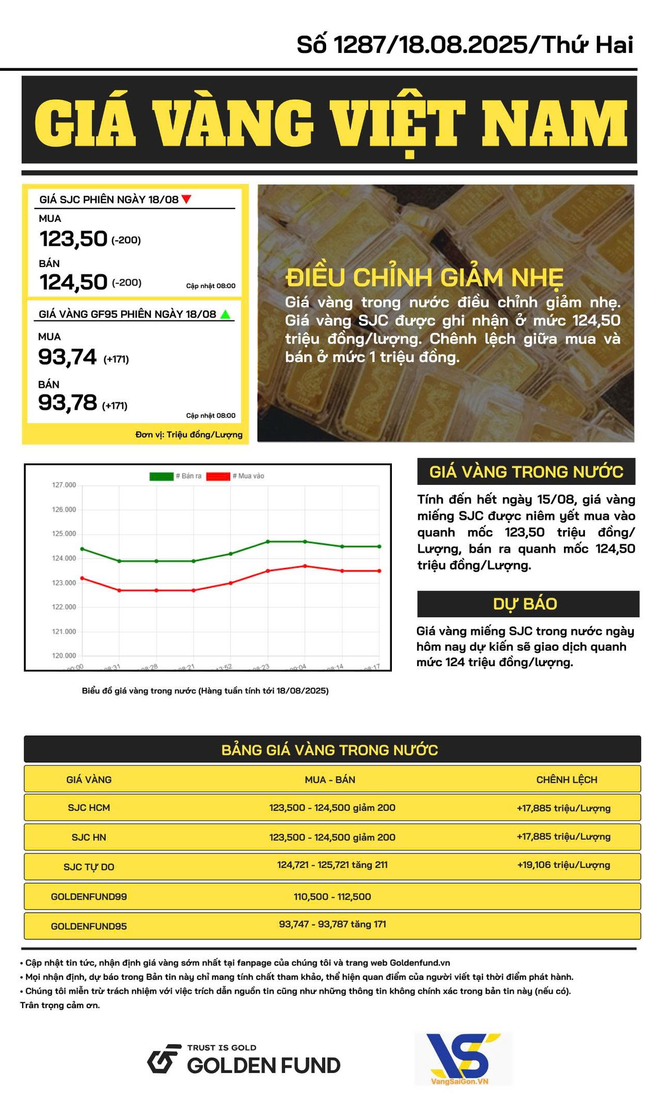 Giá vàng miếng SJC trong nước ngày hôm nay 18/08/2025 dự kiến sẽ giao dịch quanh mức 124 triệu đồng/Lượng.