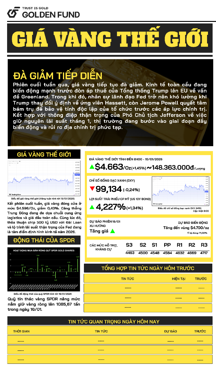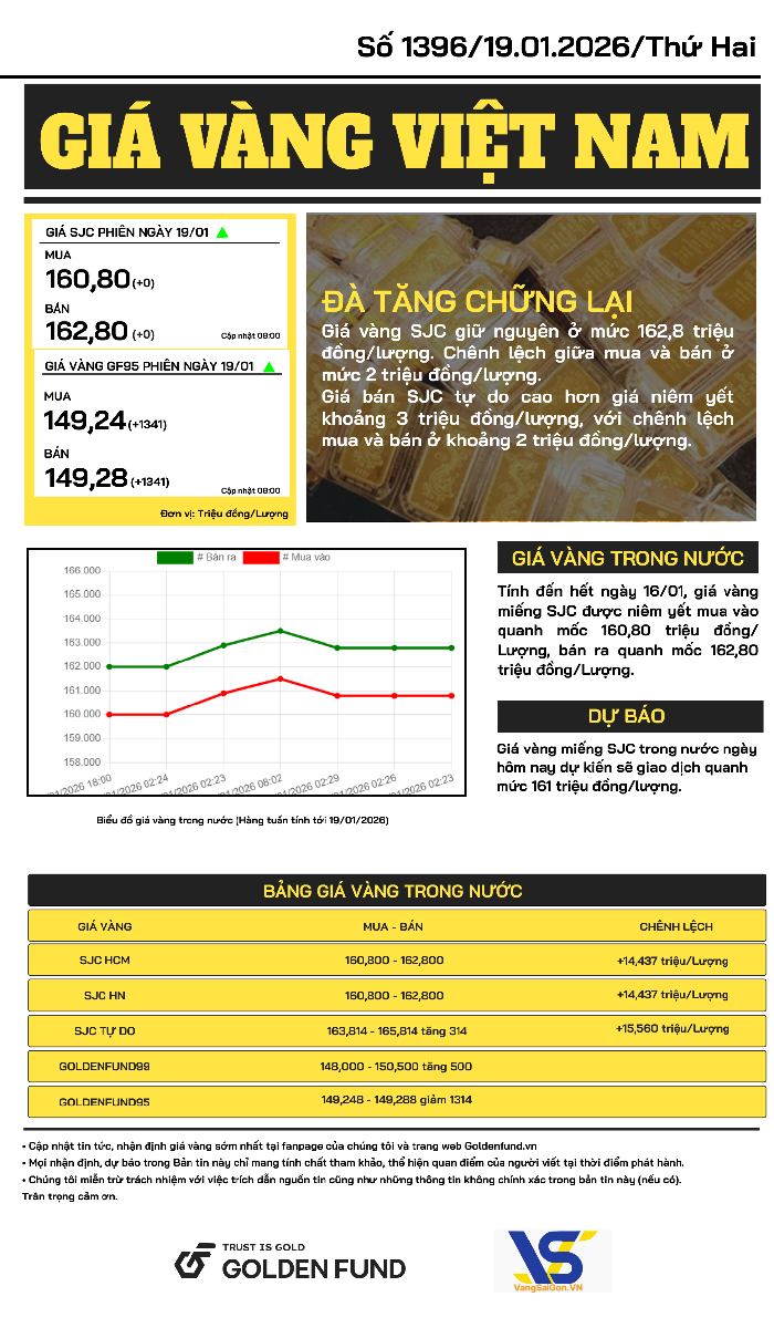 Giá vàng tiếp tục giảm trong phiên cuối tuần trong bối cảnh căng thẳng thuế quan Mỹ - EU liên quan Greenland, bất ổn nhân sự Fed và quan điểm thận trọng của Phó Chủ tịch Fed Jefferson về lãi suất. Thị trường bước vào giai đoạn biến động cao.Giá vàng SJC đi ngang ở mức 162,8 triệu đồng/lượng. Chênh lệch mua - bán khoảng 2 triệu đồng/lượng; giá SJC tự do cao hơn niêm yết khoảng 3 triệu đồng/lượng, với mức chênh lệch mua - bán là 2 triệu đồng/lượng.