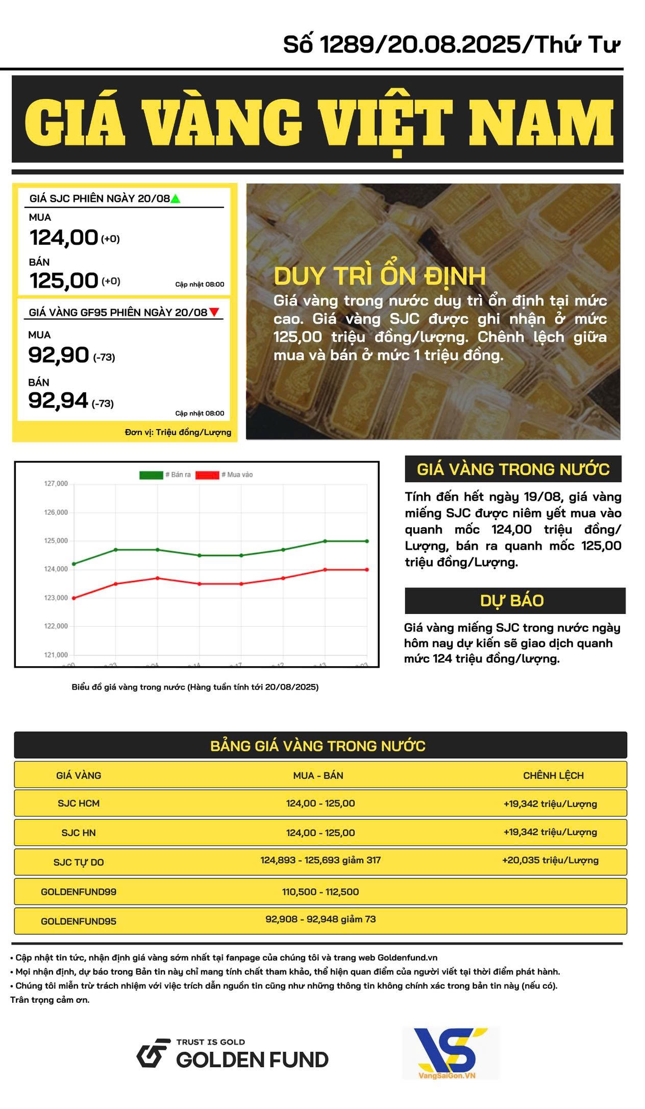 Giá vàng miếng SJC trong nước ngày hôm nay 20/08/2025 dự kiến sẽ giao dịch quanh mức 125 triệu đồng/Lượng.