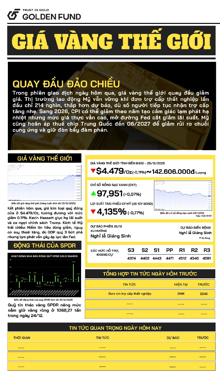 Trong phiên giao dịch hôm qua, giá vàng thế giới giảm trở lại khi dữ liệu lao động Mỹ vẫn tích cực, với đơn xin trợ cấp thất nghiệp lần đầu ở mức 214 nghìn, thấp hơn dự báo, trong khi CPI năm 2026 có thể giảm theo năm do hiệu ứng nền nhưng mức giá thực vẫn cao, tạo dư địa cho Fed cân nhắc cắt lãi; đồng thời, Mỹ hoãn áp thuế chip Trung Quốc đến 06/2027 nhằm giảm rủi ro chuỗi cung ứng. Trong nước, giá vàng SJC tăng mạnh lên 159,20 triệu đồng/lượng với chênh lệch mua - bán khoảng 2 triệu đồng.