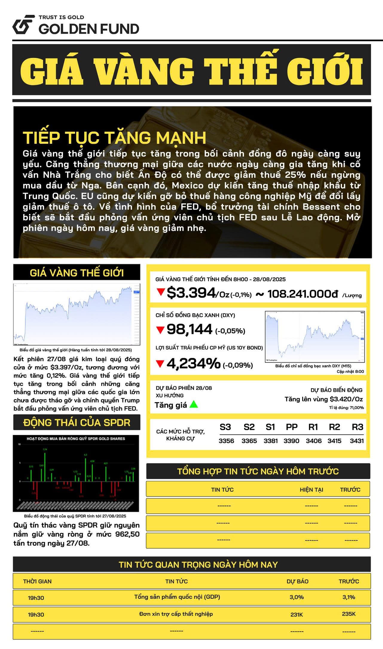 Giá vàng thế giới tiếp tục tăng, được hỗ trợ bởi đồng đô suy yếu. Căng thẳng thương mại giữa các nước lớn vẫn chưa được giải toả, khi Mỹ muốn Ấn Độ dừng mua dầu từ Nga, Mexico dự kiến áp thuế lên Trung Quốc. Trong tuần, thị trường chờ đợi báo cáo PCE lõi, một chỉ số quan trọng giúp FED có thêm thông tin cho quyết định lãi suất vào tháng 9 tới. Giá vàng trong nước tiếp tục tăng mạnh.