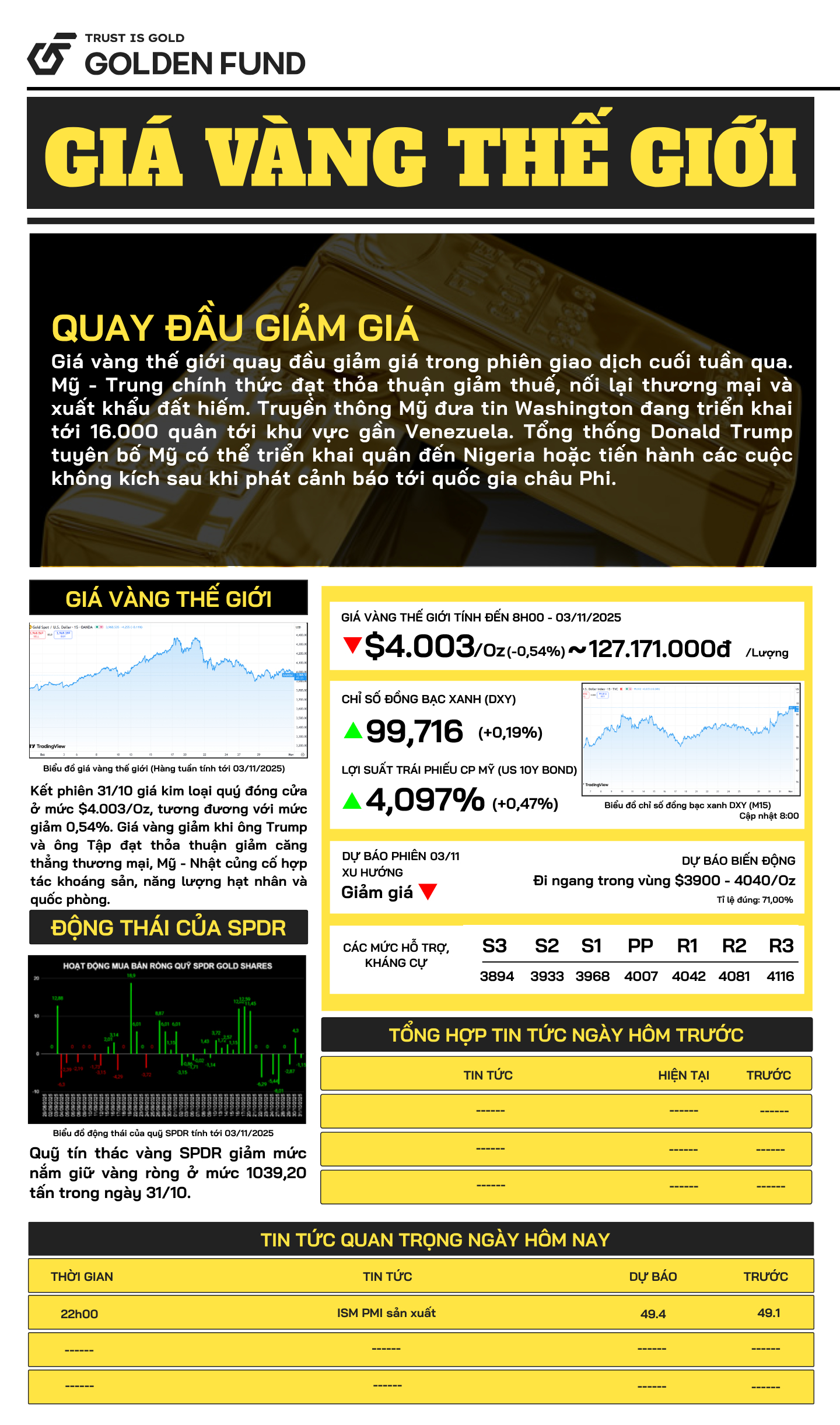 Giá vàng thế giới quay đầu giảm giá trong phiên giao dịch cuối tuần qua. Mỹ - Trung chính thức đạt thỏa thuận giảm thuế, nối lại thương mại và xuất khẩu đất hiếm. Truyền thông Mỹ đưa tin Washington đang triển khai tới 16.000 quân tới khu vực gần Venezuela. Tổng thống Donald Trump tuyên bố Mỹ có thể triển khai quân đến Nigeria hoặc tiến hành các cuộc không kích sau khi phát cảnh báo tới quốc gia châu Phi.