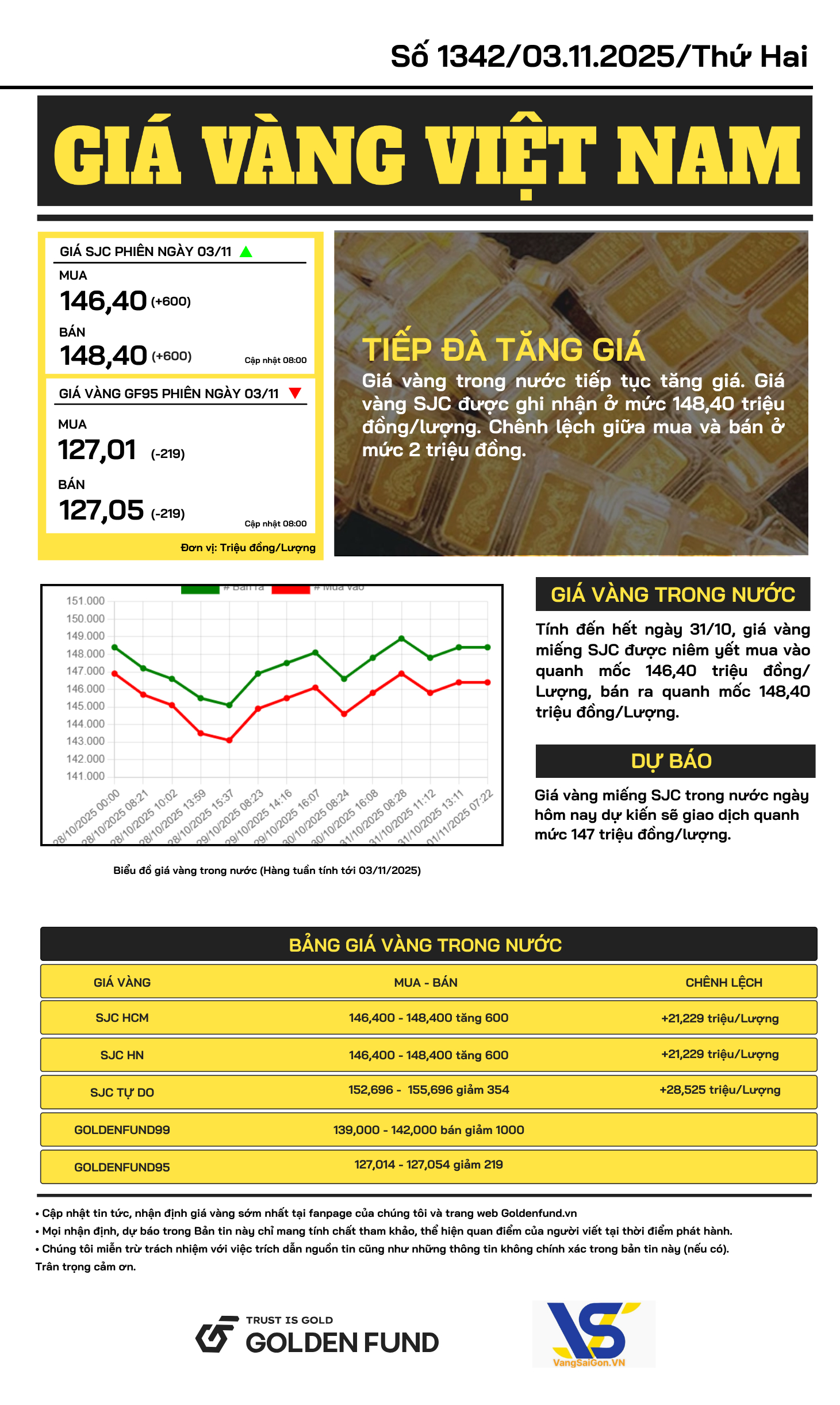 Giá vàng miếng SJC trong nước ngày hôm nay 03/11/2025 dự kiến sẽ giao dịch quanh mốc 147 triệu đồng/lượng.
