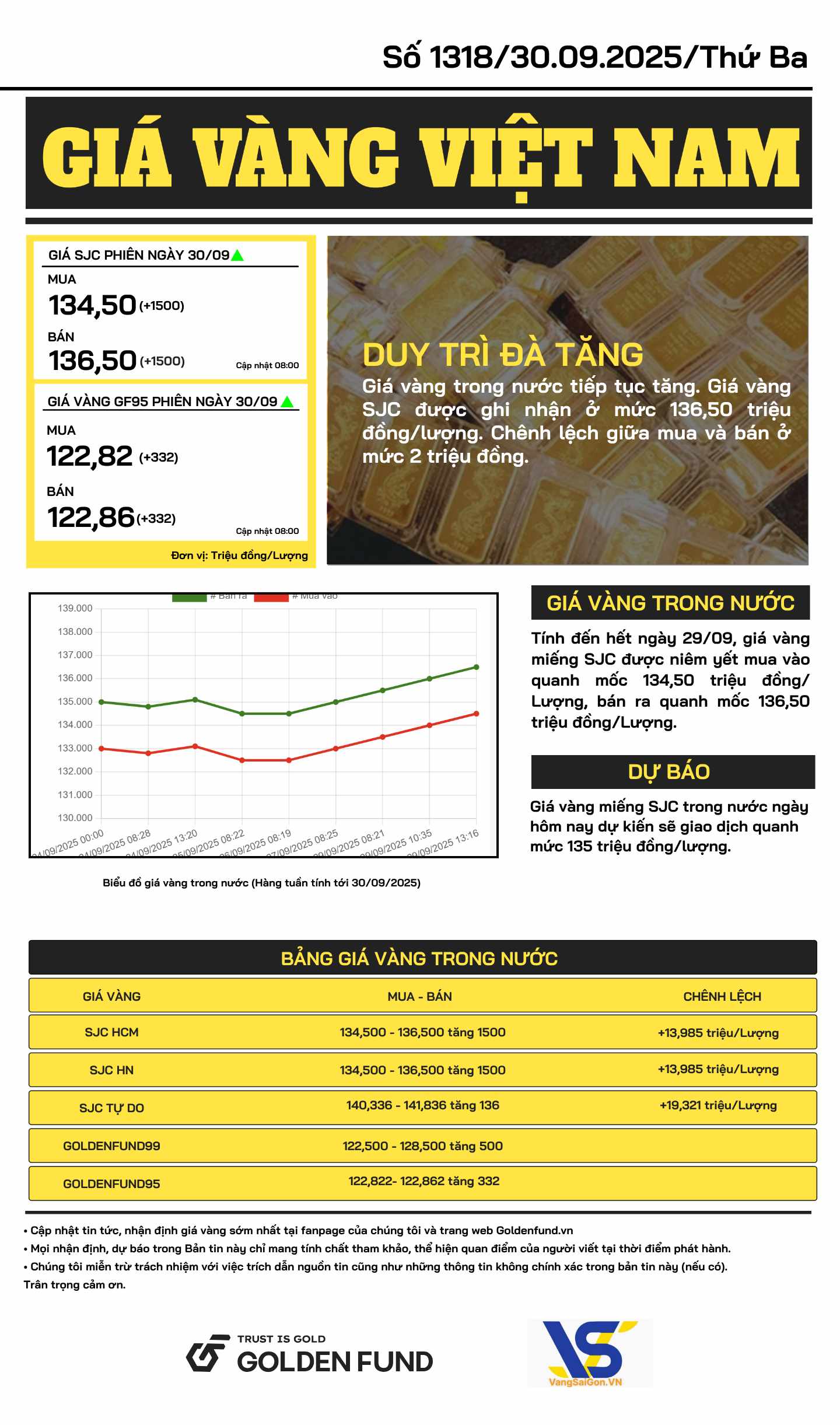 Giá vàng miếng SJC trong nước ngày hôm nay 30/09/2025 dự kiến sẽ giao dịch quanh mốc 135 triệu đồng/Lượng.